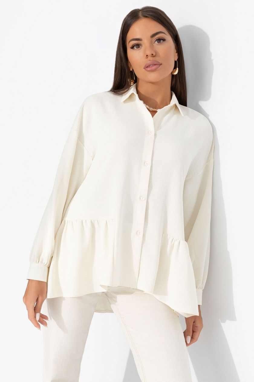 Блузка свободная с воланами от компании Charutti, выполнена из плательно-костюмного полотна "Дорна". Отложной воротник на стойке. Длинный рукав. Застежка на пуговицы. Линия плеча слегка спущена. Материал изделия жатый. Прекрасное решение для создания романтичного образа.