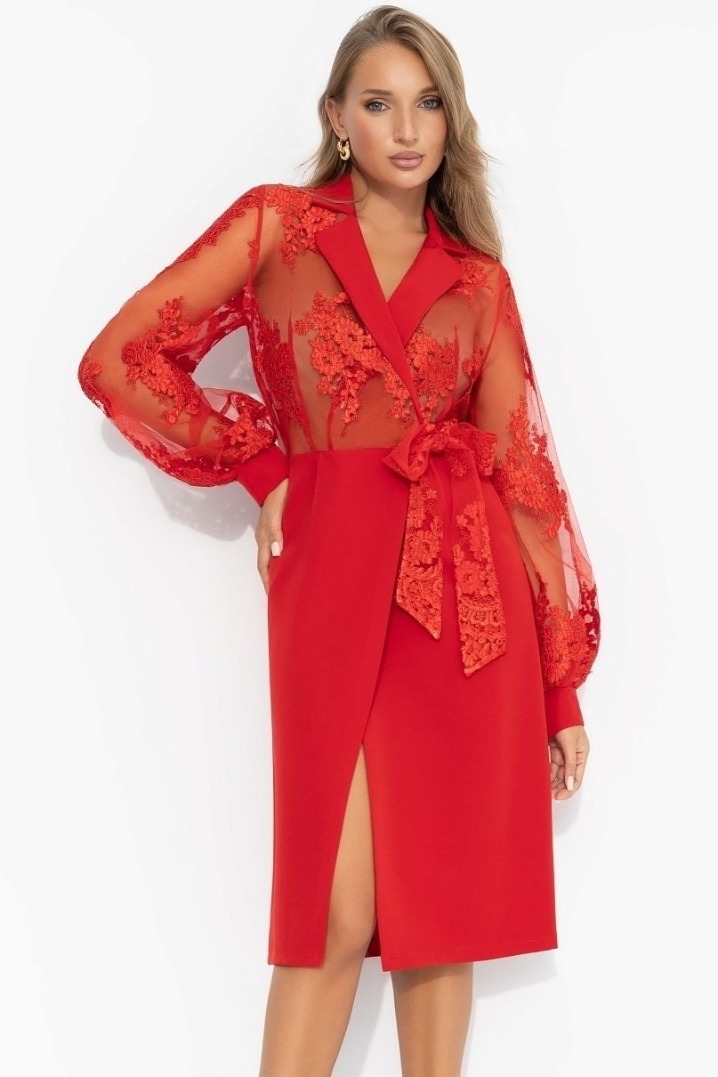 Платье красное с кружевом на запахе от компании Charutti. Модель полуприлегающего силуэта, выполнена из костюмного полотна "барби". Глубокий вырез с лацками. Верх изделия просвечивает, рекомендуем пододевать бесшовное белье или топ телесного цвета.Завязки на талии широкие в тон кружева. Это больше, чем платье.