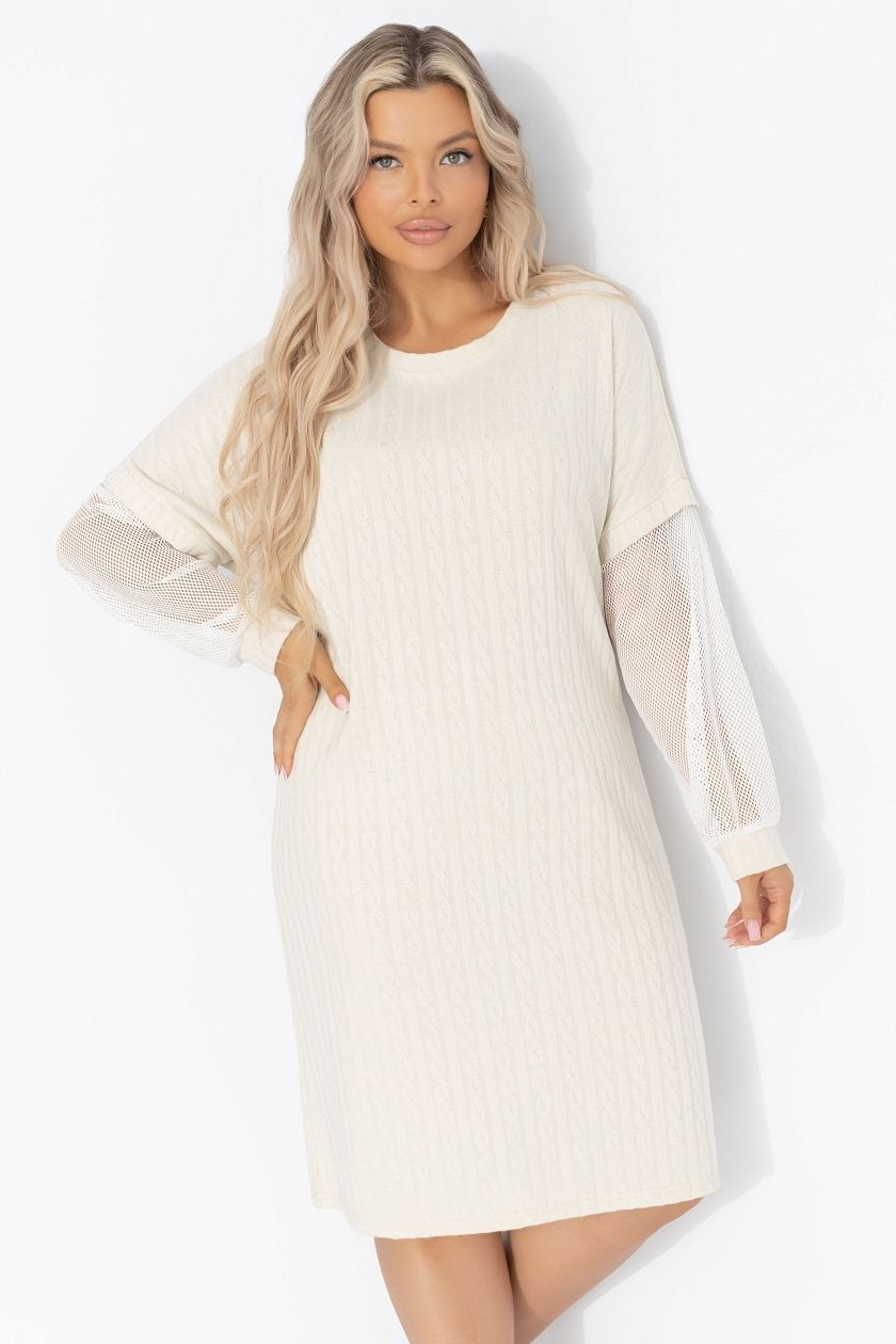 Платье вязаное бежевое с рукавами из сетки от компании Charutti. Модель прямого силуэта в длине до колена. Выверенный крой обеспечивает идеальную посадку на любом типе фигуры. Рукава длинные. Материал изделия текстурный. Идеальный выбор для Вашего стильного гардероба.