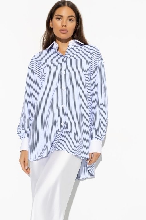 Рубашка в полоску с длинными рукавами от компании Charutti. Модель свободного силуэта, выполнена из рубашечной ткани и поплина. Горловина оформлена отложным воротником на стойке. Втачные рукава на манжетах. Центральная застёжка на петли и пуговицы. Низ фигурный. Отличный выбор как для отдыха, так и для деловой встречи.