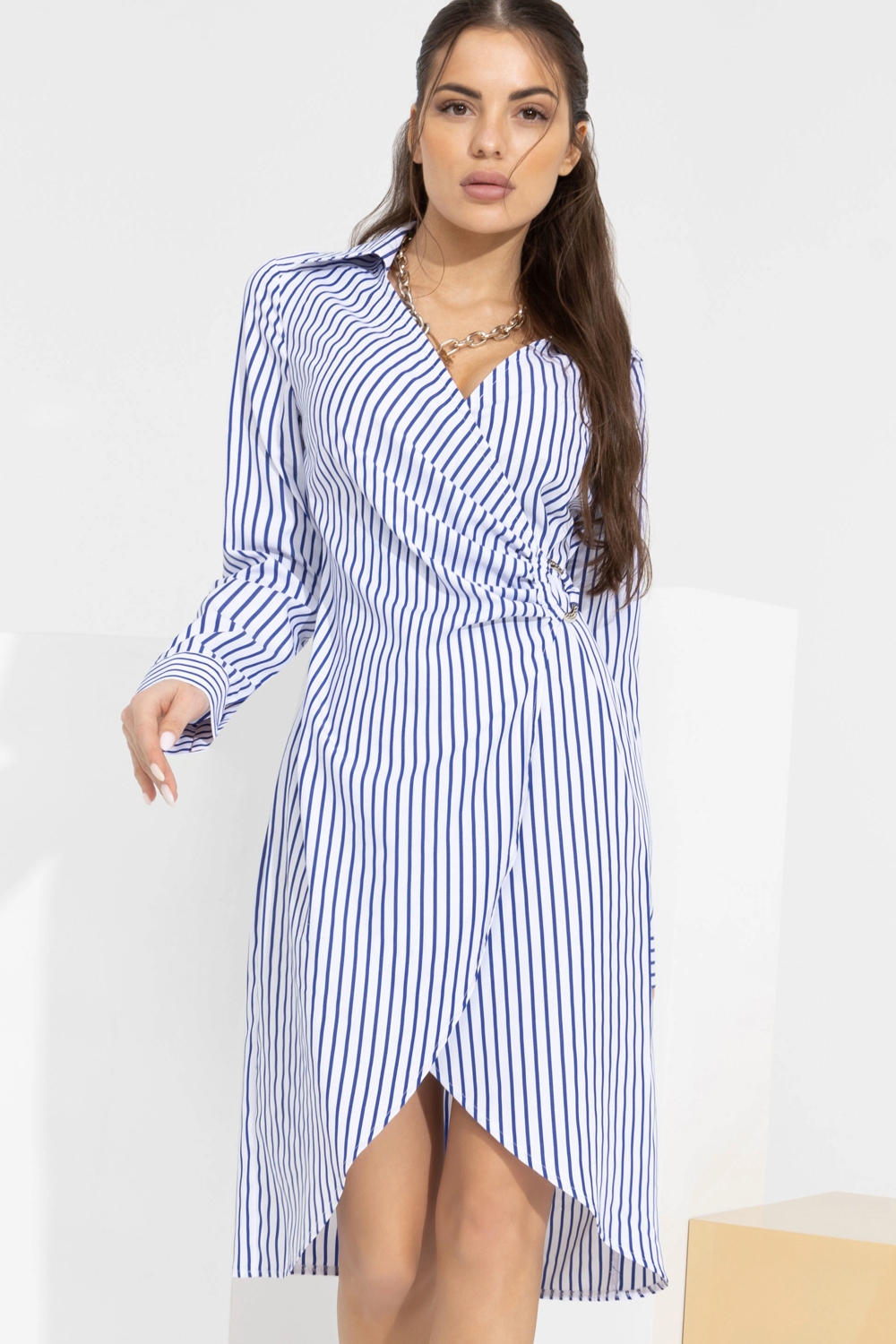Стильное женское платье от компании Charutti. Модель полуприлегающего силуэта, выполнена из ткани плательная полоска в синем цвете. V-образный вырез горловины с отложным воротником на стойке на запах. Втачные длинные рукава на манжетах. По линии талии металлическое кольцо. Низ с фигурным разрезом. Идеальный выбор на каждый день.