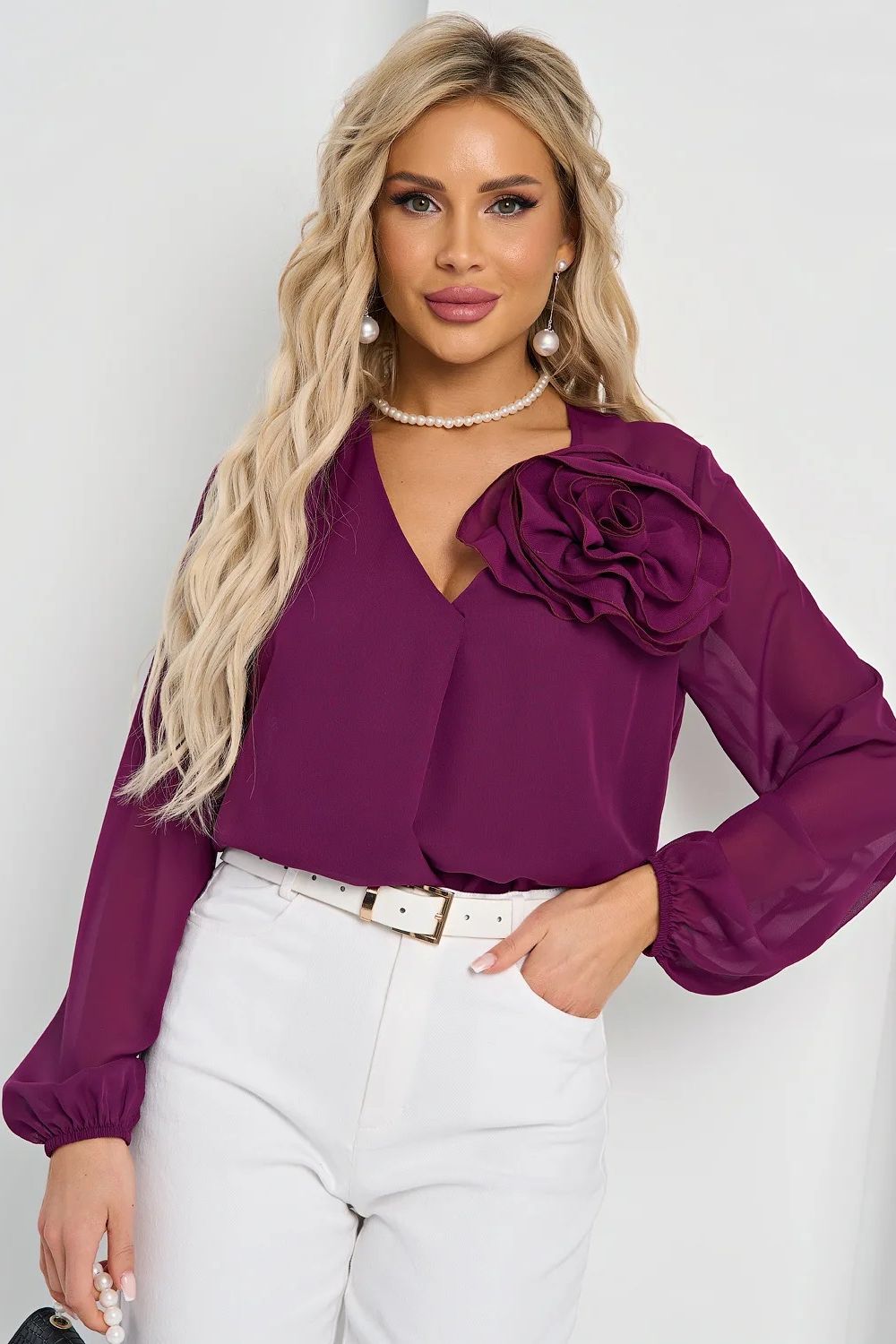 Блузка однотонная с объёмным цветком от компании Jetty. Модель свободного силуэта, выполнена из блузочной ткани сливового оттенка. V-образный вырез горловины. Втачные длинные рукава с резинкой. Без застёжки и подклада. Прекрасный образ для создания женственного образа.