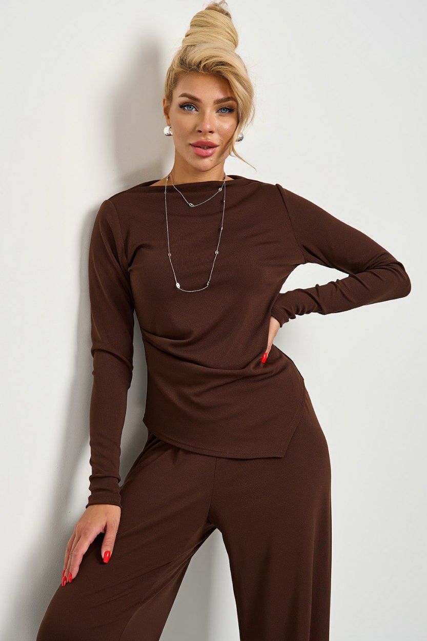Лонгслив трикотажный шоколадного цвета от компании Jetty. Модель прилегающего силуэта, воротник - лодочка. Спереди изделия по одному краю идет сборка. Длинные втачные рукава. Низ изделия фигурный спереди и сзади. Прекрасный образ для повседневной носки.