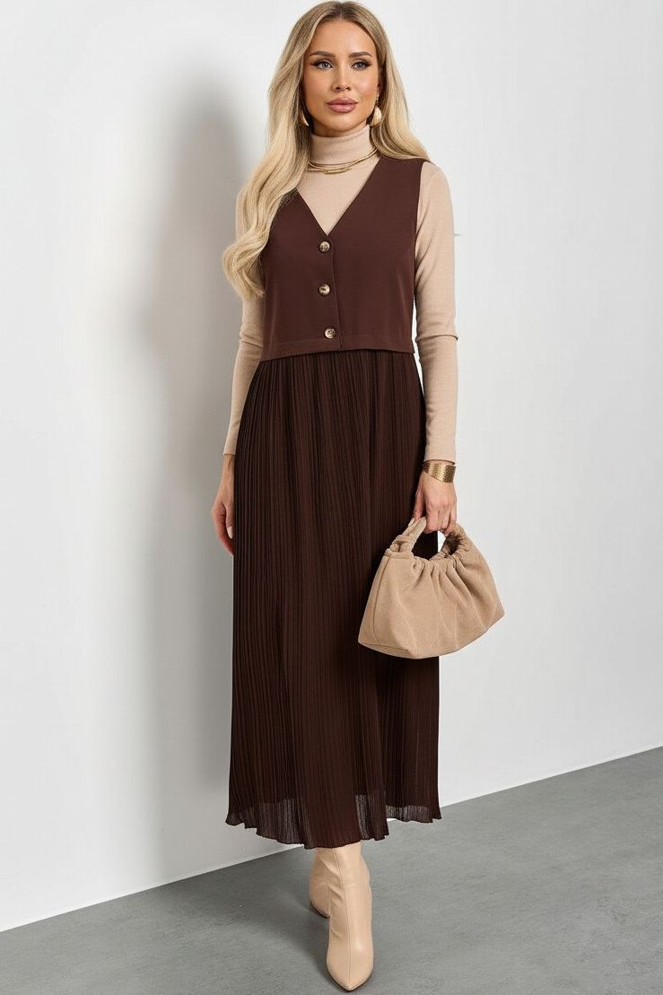 Платье комбинированное шоколадного цвета от производителя Jetty. Верх изделия выполнен из костюмной ткани, юбка из жатого шифона с подкладом. Верх платья - имитация жилетки. По переду изделия пуговицы. Стильный вариант для повседневной носки.