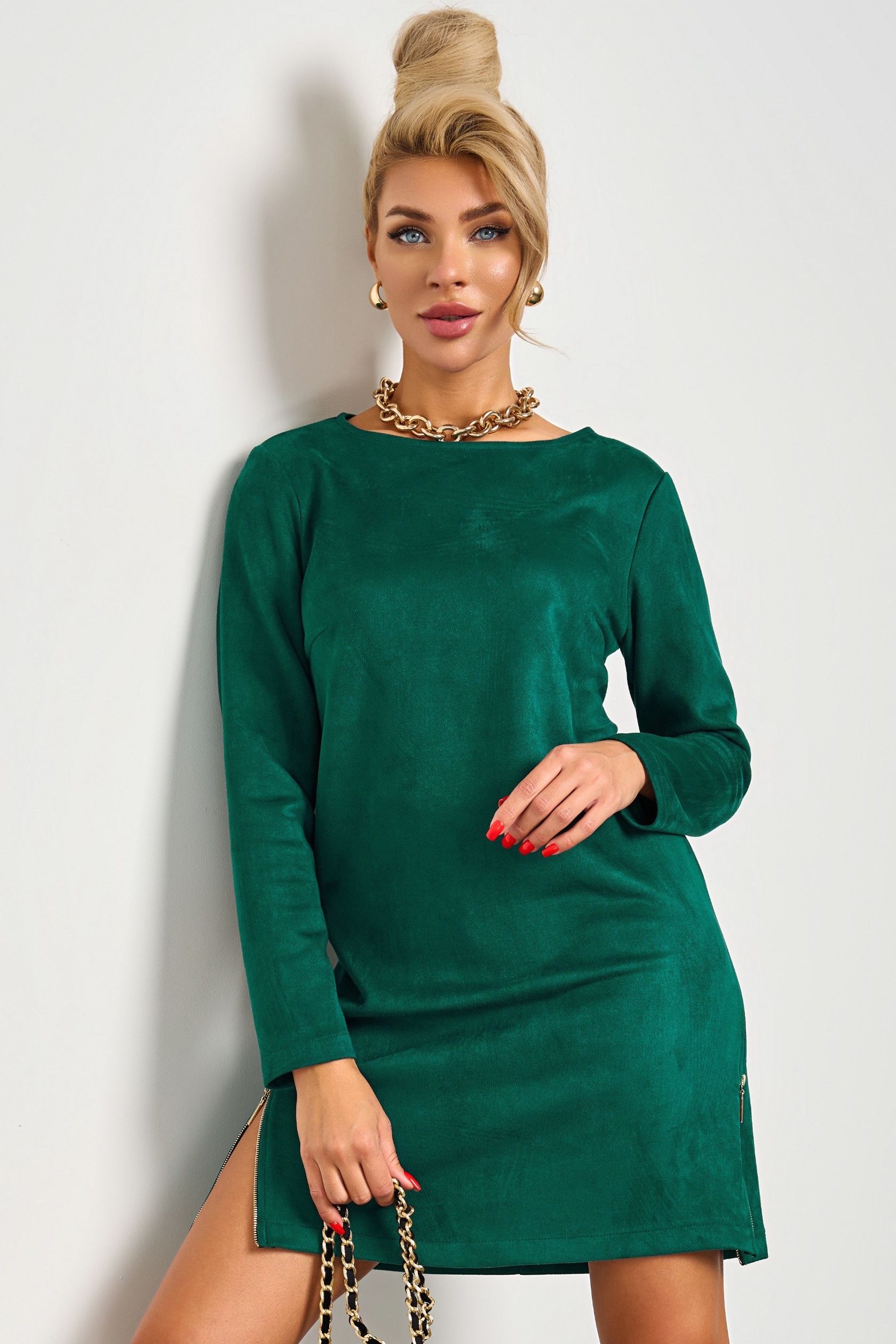 Платье зелёное из искусственной замши от компании Jetty. Модель А-силуэта с вырезом горловины лодочка. Длинный втачной рукав. Спинка со средним швом. В боковых швах - разрез на молнии. Отличный выбор для создания элегантного образа.
