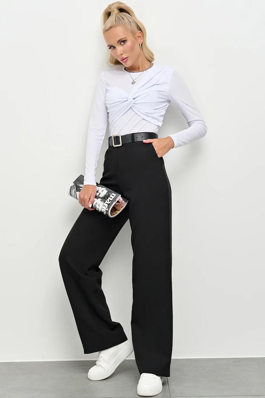 Прямые брюки с карманами от бренда Jetty, выполнены из чёрной костюмной ткани. Притачной пояс оснащен петлями для ремня. По переду застёжка на молнию и пуговицу. Отличный выбор для повседневной носки. Ремень в комплект не входит.