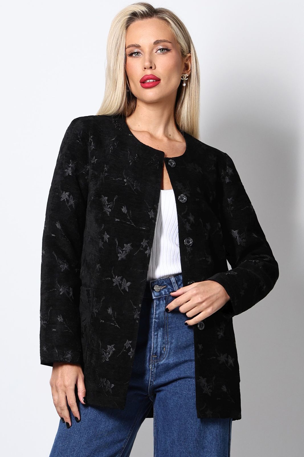 Жакет из костюмного плотного вельвета с цветочным принтом в чёрном цвете Идеальный баланс, шик