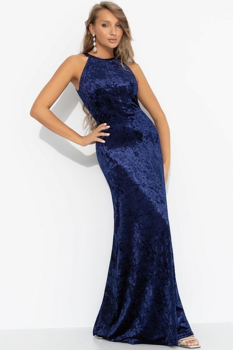 Платье синее бархатное с акцентной спинкой от компании Charutti. Модель полуприлегающего силуэта. Комфортная посадка, платье красиво драпируется, подчеркивает фигуру. Идеальный выбор для создания женственного образа.