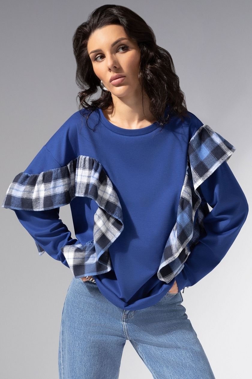 Лонгслив синий в стиле пэчворк от компании Charutti. Лонгслив свободного кроя, выполнен из трикотажного полотна. Круглый вырез горловины. Модель украшена элегантными объемными рюшами, которые создают выразительный акцент и подчеркивают женственный силуэт. Идеальный выбор для создания неповторимого образа.