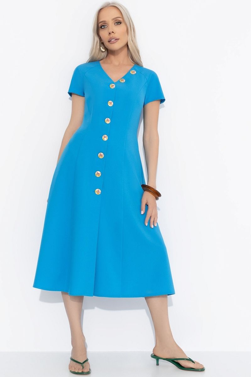 Платье голубое с карманами от компании Charutti. Модель приталенного силуэта, выполнена из ткани "Габардин". Акцентные пуговицы изделия. Есть деликатный разрез спереди по линии пуговиц. Идеальное решение для Вашего стильного гардероба.