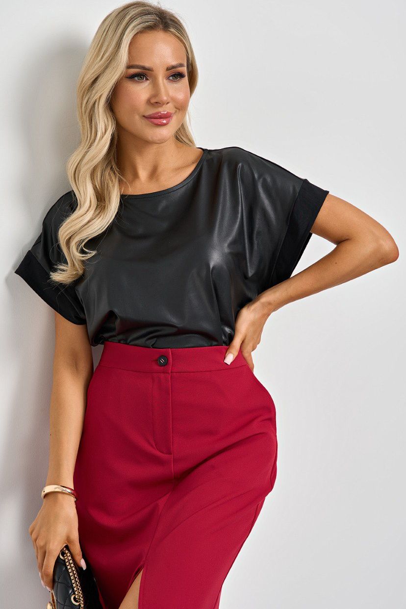 Блузка чёрная из искусственной кожи от компании Jetty. Изделие прямого силуэта, круглый вырез горловины. Короткий цельнокроеный рукав. Прекрасный выбор для Вашего повседневного гардероба.
