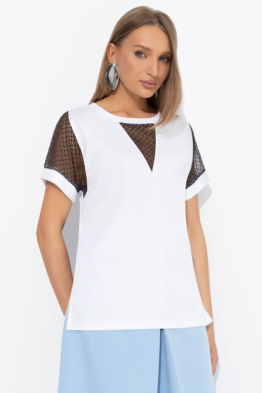 Футболка белая трикотажная с встауками из сетки от компании Charutti. Модель свободного силуэта, округлый вырез горловины. Короткие рукава. Без застёжки. Низ ровный, без разрезов. Идеальный выбор для создания женственного образа.