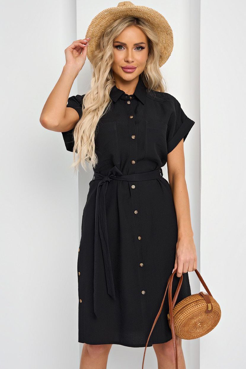 Платье-рубашка чёрное с поясом от компании Jetty. Модель ппрямого силуэта в стиле "сафари" из льна. Короткий цельнокроеный рукав на широкой манжете. Воротник рубашечного типа. В боковых швах расположены декоративные планки с роговыми пуговицами. Спинка с отрезной кокеткой. Идеальный выбор на каждый день.